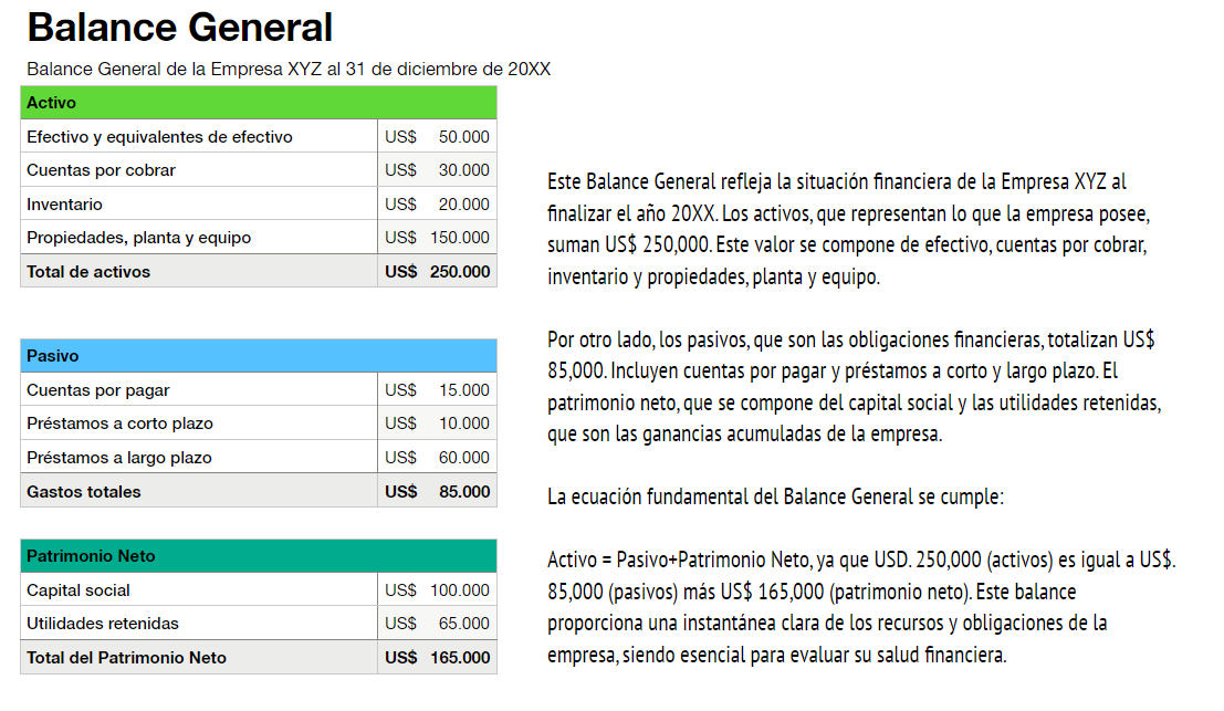 El Balance General es como la foto fija que captura la salud financiera de una empresa en un momento específico. Se divide en dos secciones principales: activos y pasivos. Los activos representan todo lo que la empresa posee (por ejemplo, efectivo, propiedades, inventario), mientras que los pasivos son las obligaciones financieras (como deudas y préstamos). La ecuación básica es: